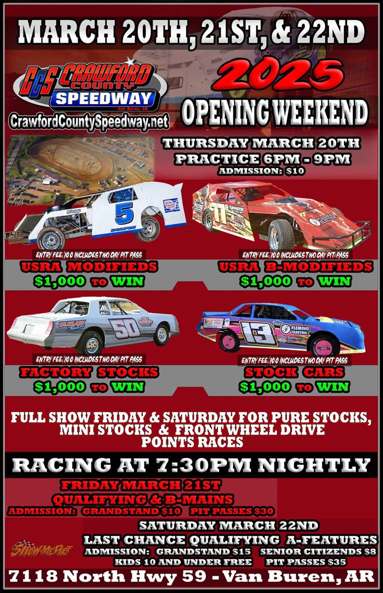 The wait is over! Crawford County Speedway is revving up for the 2025 racing season with an action-packed Season Opener Weekend. Kicking off on Thursday, March 20th, with practice sessions and leading into qualifying, features, and more!